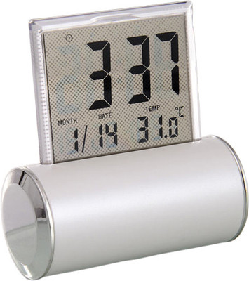 Spacious stationary tumbler Unique pyramid style side designing beautifies your desk Digital alarm clock with day, date and temperature display Excellent branding area