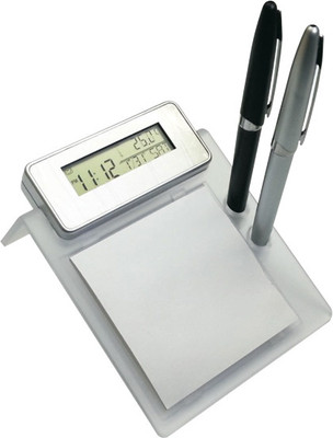 A wonderful product for your table. A pad with double pen holder along with a digital alarm clock with day, date and temperature