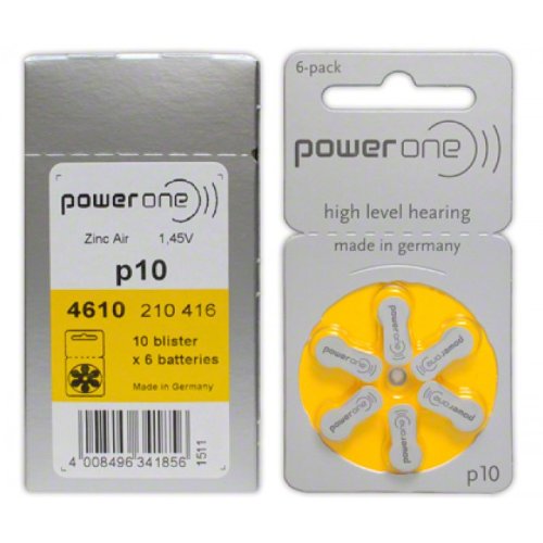 Power One zinc air batteries are made in Germany by Varta Microbatteries. Power One batteries is regarded as one of Europe's leading brands. The high and stable voltage level ensures long running times in high power and digital hearing devices. Power One batteries have extra long tabs for easy handling and insertion of the cell into the hearing device. Power One 10 Specifications Batteries per packet 6 IEC PR70 Size Colour Code Yellow Packaging Rotary dial pack Voltage (V) 1.4 Chemical system Zinc-Air Typical capacity (mAh) 95 Height(mm) 3.55 Diameter (mm) 5.80