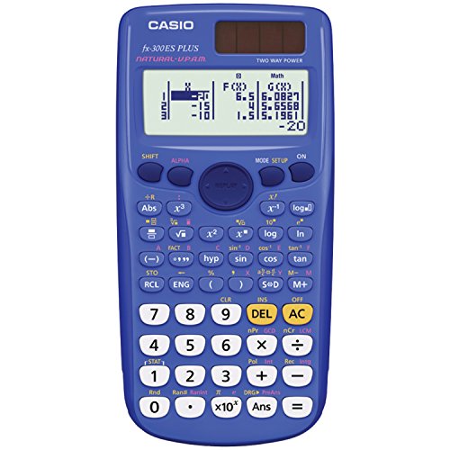 The FX-300ES Plus calculator features a two-line display and supports complex number calculations, algebra, calculus, and 18 levels of parentheses. Always powered up, it''s just as useful in a household or office for all your calculating needs, from finances to converting cooking measurements, and for anything else you can think of when you wish you had a calculator at hand. The large, readable two-line display exhibits 10 digits, shows the problem as you write it, and then shows the answer alongside, permitting better tracking of your equation-solving process. With the Casio FX-300w, if you make an Input error, you can quickly clear it with the backspace key. Tap the auto replay function to check your last equation. You can also use 252 built-in mathematics functions, enter fractions, raise y to the x power, figure standard deviations, process degree/radian/grad conversions, calculate sine, cosine, tangent, and inverse, and compute permutations and combinations. Plus, call upon the FX-300''s basic scientific, exponential, and trigonometric functions for everything you need to complete your assignments and lab work. Key in and Program formulas to save for future uses. The FX-300 provides one independent and six constant Memory keys. It has an efficient key layout, making this an easy-to-use basic scientific calculator, offering all the functions you''ll need in a solidly constructed unit. And solar power means never replacing batteries; the Backup battery assures you''ll always have power when you need it.