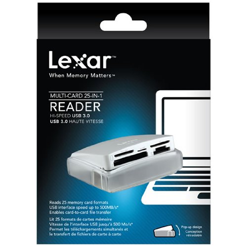 Extremely versatile-reads 25 popular memory card formats* Leverages SuperSpeed USB 3.0 technology for high-speed file transfers, with a USB interface speed up to 500MB/s** Enables concurrent downloads and card-to-card file transfer Pop-up design protects card slots Quickly and easily transfer photos, videos, music, and files Includes USB 3.0 cable-no external power supply needed One-year limited warranty Multi-Card 25-in-1 USB 3.0 Reader with Pop-Up Design The Lexar® Multi-Card 25-in-1 USB 3.0 Reader is an easy-to-use, all-in-one file transfer solution. The reader has an innovative pop-up design, supports 25 memory card formats,* and enables concurrent downloads and card-to-card file transfer. Versatile, High-Speed File Transfer Solution Supports Multiple Card Formats for Impressive Versatility. The Lexar Multi-Card 25-in-1 USB 3.0 Reader has five slots and supports more than two dozen of the most popular card formats, making it easy to transfer files between your digital camera, MP3 player, mobile phone, and computer. Quickly Transfer Files with USB 3.0 Technology. Now you can take advantage of the USB 3.0 port in your new laptop or computer. The Lexar Multi-Card 25-in-1 USB 3.0 Reader leverages SuperSpeed USB 3.0 technology to provide high-speed transfer with a USB interface speed up to 500MB/s.** With read speeds up to 5x faster than USB 2.0, this means you can quickly transfer your photo, video, music, and other files from device to computer.** Simply remove the card from your digital device, slide it into the reader, and drag and drop files onto your computer. And for added convenience, the reader is also backwards compatible with USB 2.0 ports.