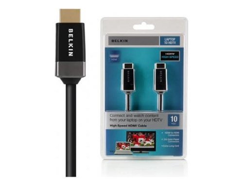 Add Belkin s HDMI cable to your entertainment system for a high-speed high-definition video and multichannel audio connection between your laptop and your television. Features 1) 24k Gold-plated connecors create precise contact for low signal loss 2) HDMI (Type A) to HDMI (Type A) connectors 3) 10ft 3m Cable length provides flexibility for console placement throughout your living room