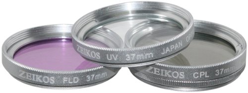 Zeikos 37mm Glass Multi Coated 3 piece Filter Kit consisting of an Ultra Violet (UV) Circular Polarizer (CPL) and a Fluorescent (FLD) Filter. They have Silver metal rings to match most cameras. Protective hard case included. Features: 1) The perfect kit for most of your needs! 2) Protect your lens get rid of reflections and correct fluorescent lighting - all in one kit!