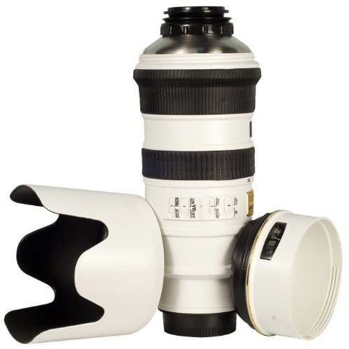 Rare White Version of N 70-200 mm Lens Thermos bottle comes with a lens hood and a carry bag and has movable buttons. It comes with vacuum insulated double layered stainless steel interior lens thermos. The tripod collar acts as a heavy duty handle and has a easy pour stopper to prevent liquid from spilling. Comes with a carry bag Comes with lens hood Vacuum sealed, double-layered stainless steel interior Leak-proof, rust-proof finish Easy-pour stopper to keep liquid from spilling over Suitable for hot and cold beverages Tripod collar to use as a handle Holds approx 500 ml of liquid.